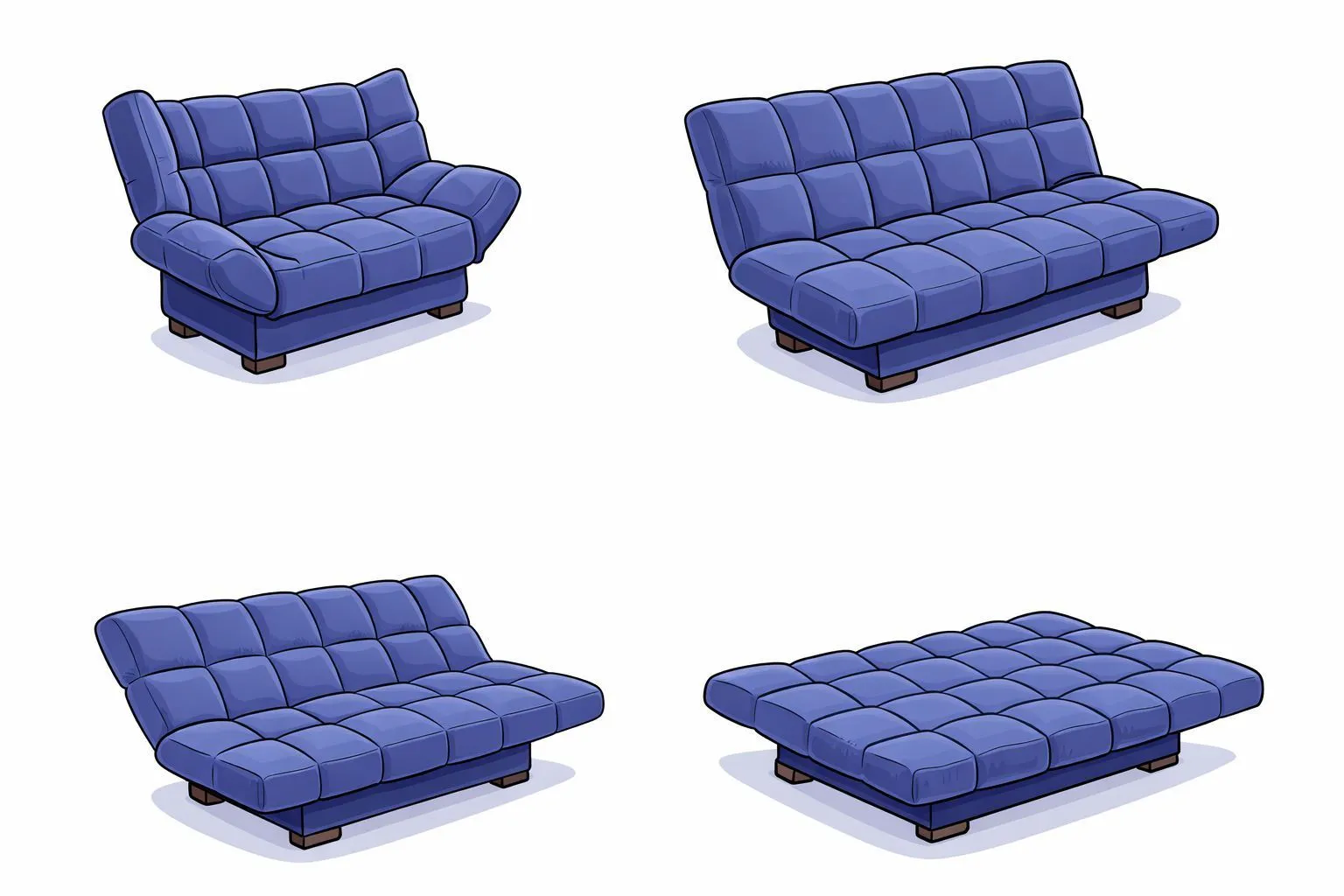 Механизмы диванов клик-клак имеют 3 или 4 доступных позиции. Обычно, большим числом положений могут похвастаться классические прямые модели, в то время как угловые варианты состоят из двух частей, в которых подвижными являются боковые секции. Раскладывание дивана осуществляется в следующей последовательности:• нижняя часть приподнимается и тянется на себя до характерного щелчка;