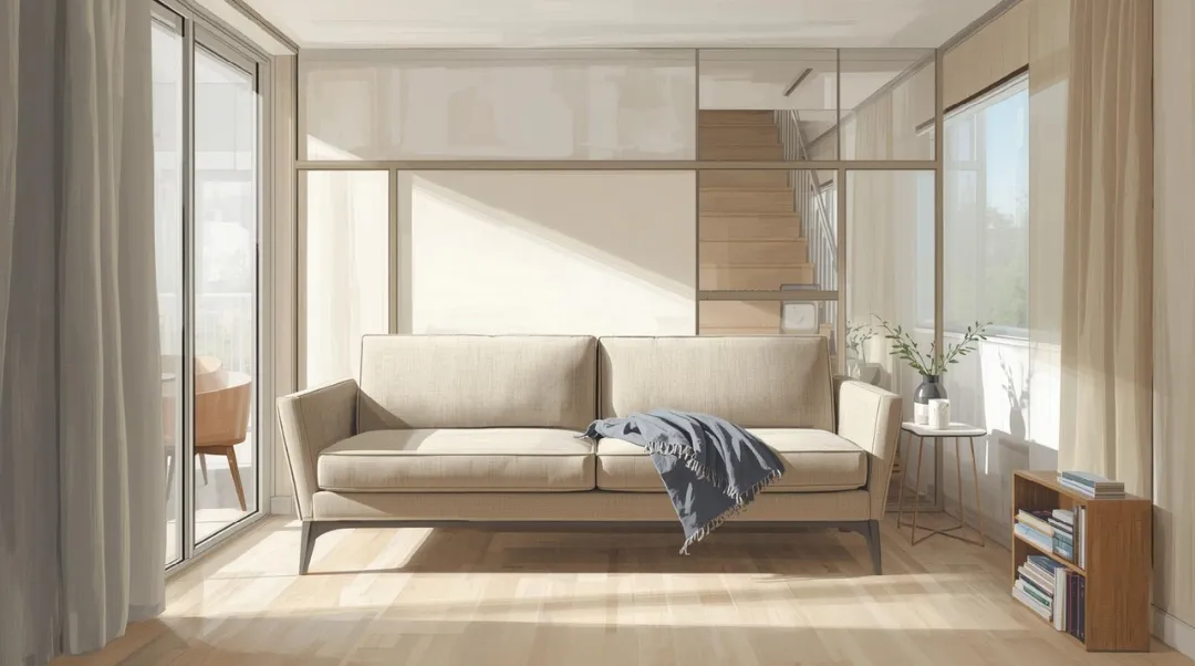 При выборе дивана для малогабаритной гостиной стоит также обратить внимание на конструкцию и функциональные особенности.