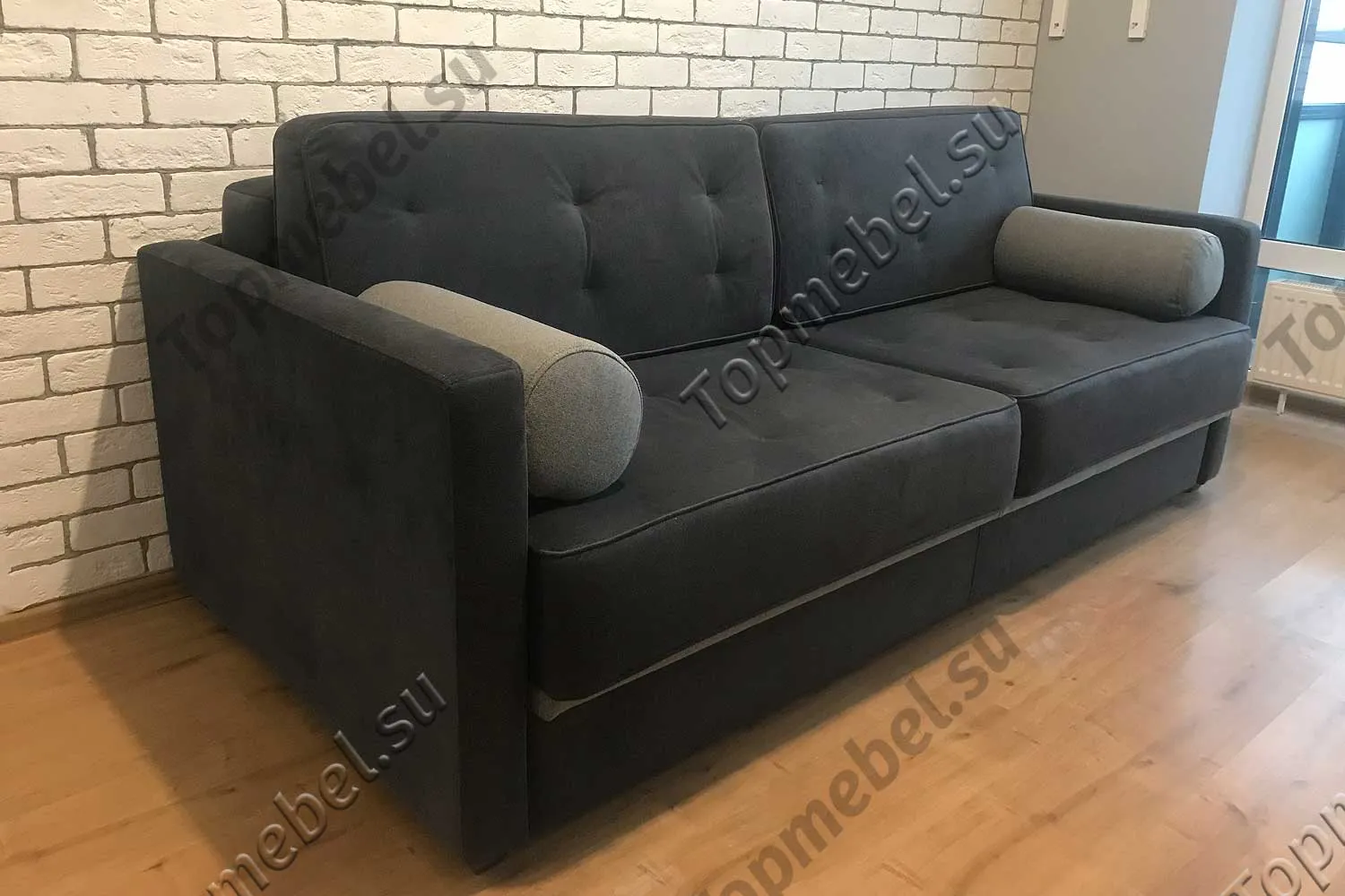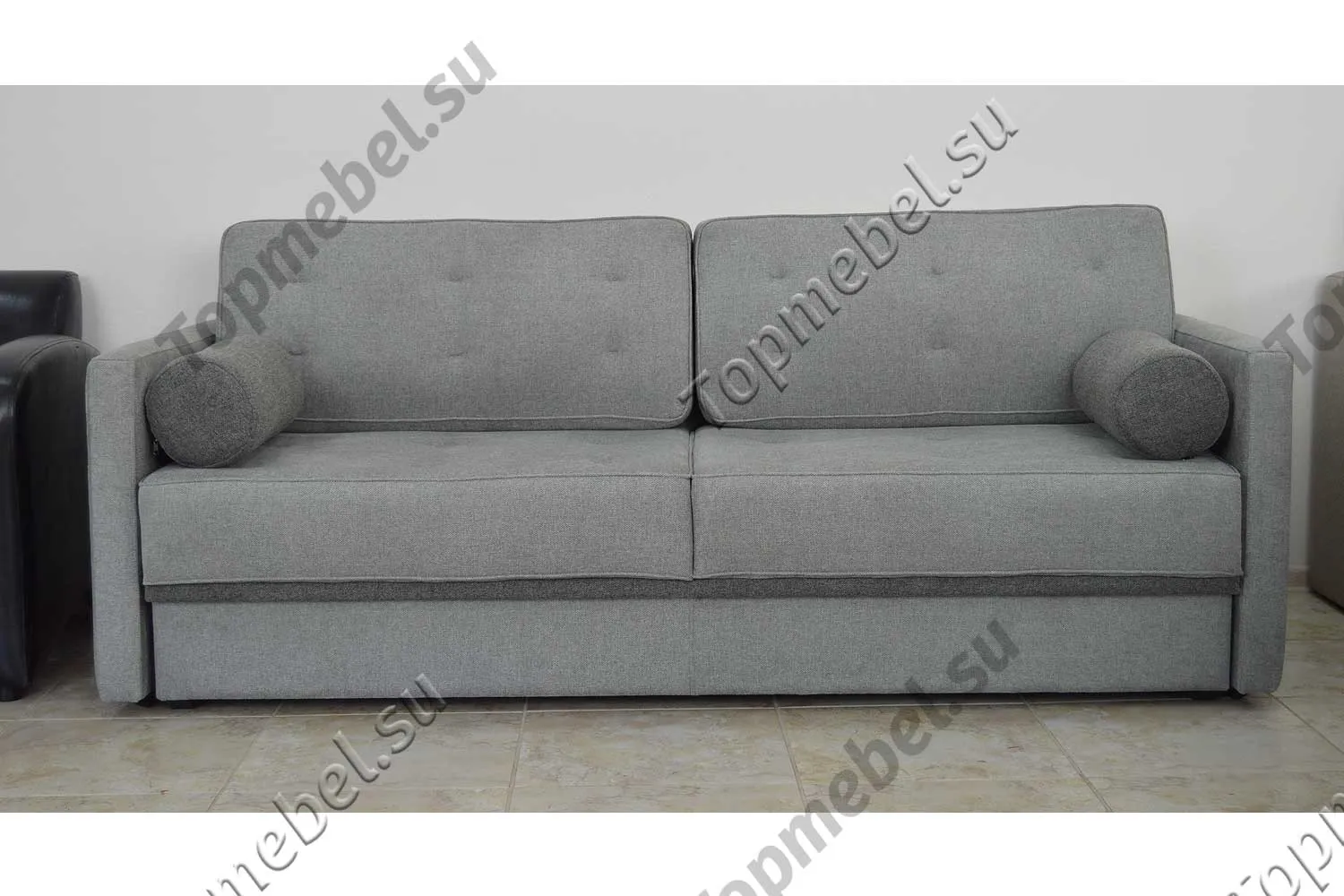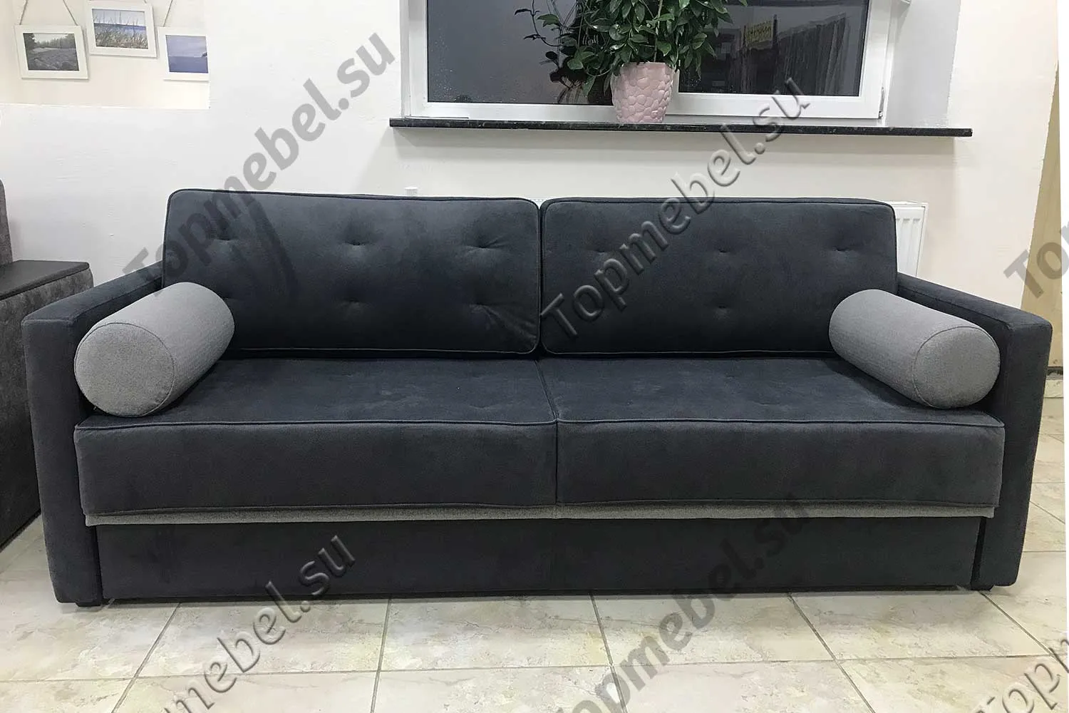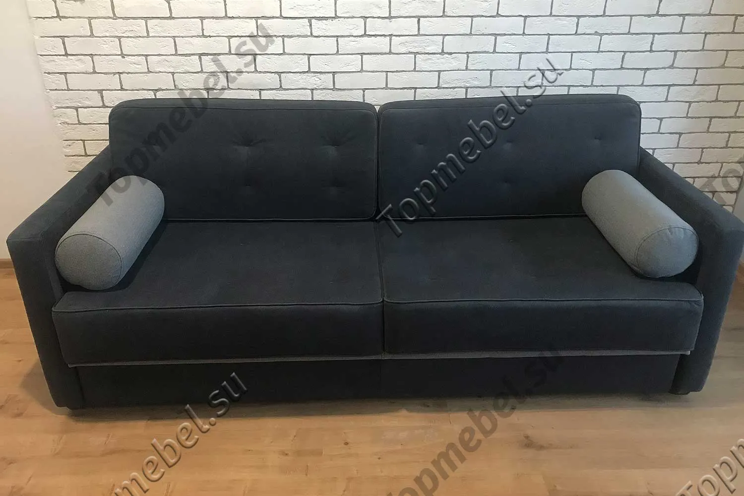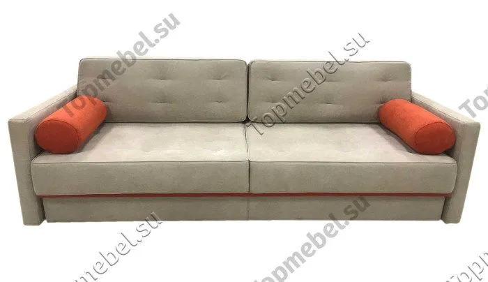 Цветность: 2 вида ткани (основная: весь диван; компаньон: маленькие подушки-тубусы и полоска внизу на царге)