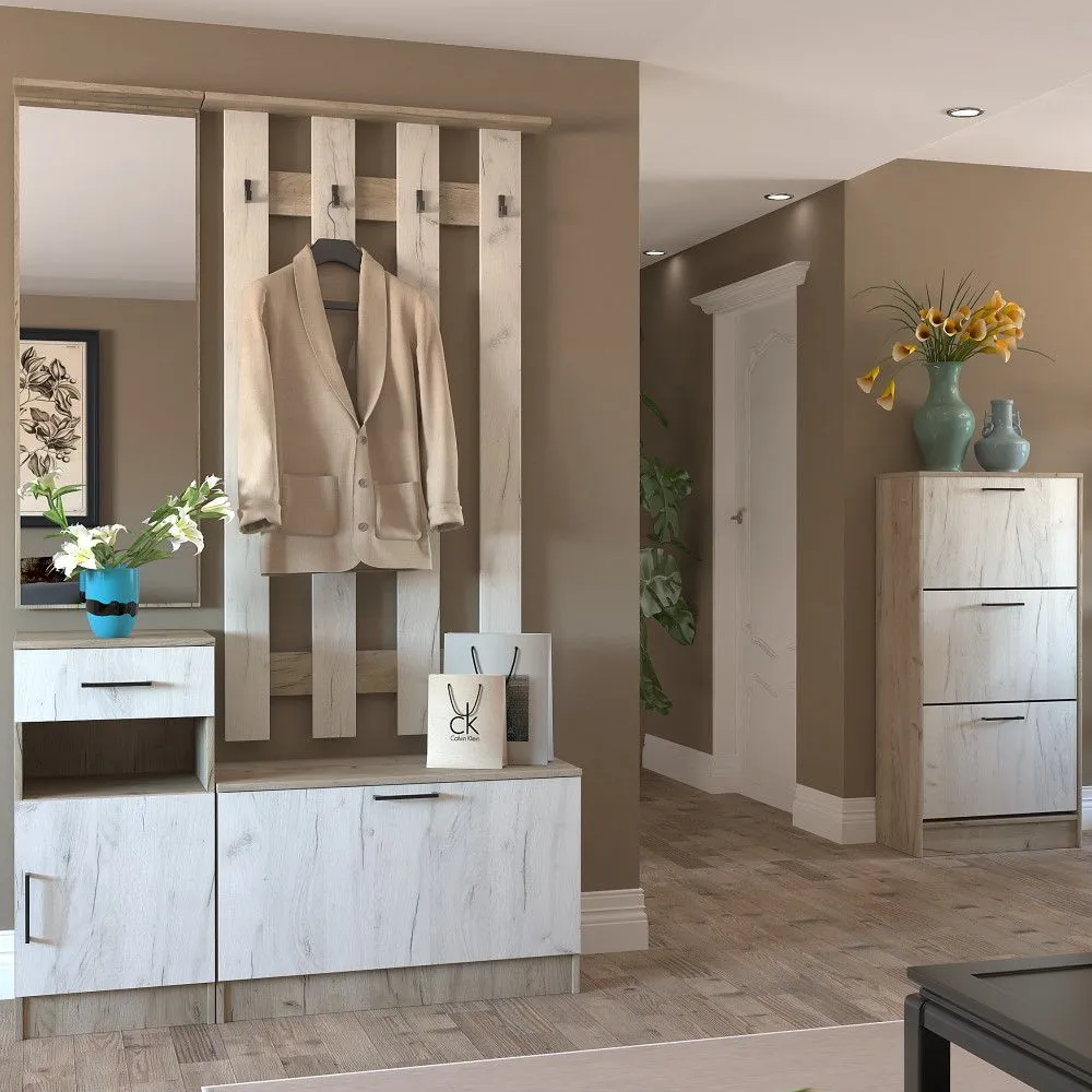 Модульная прихожая-4 состоит из большой Вешалки, Тумбы с зеркалом и Тумбы-обувницы коллекции Машенька (Серый крафт / Белый крафт).