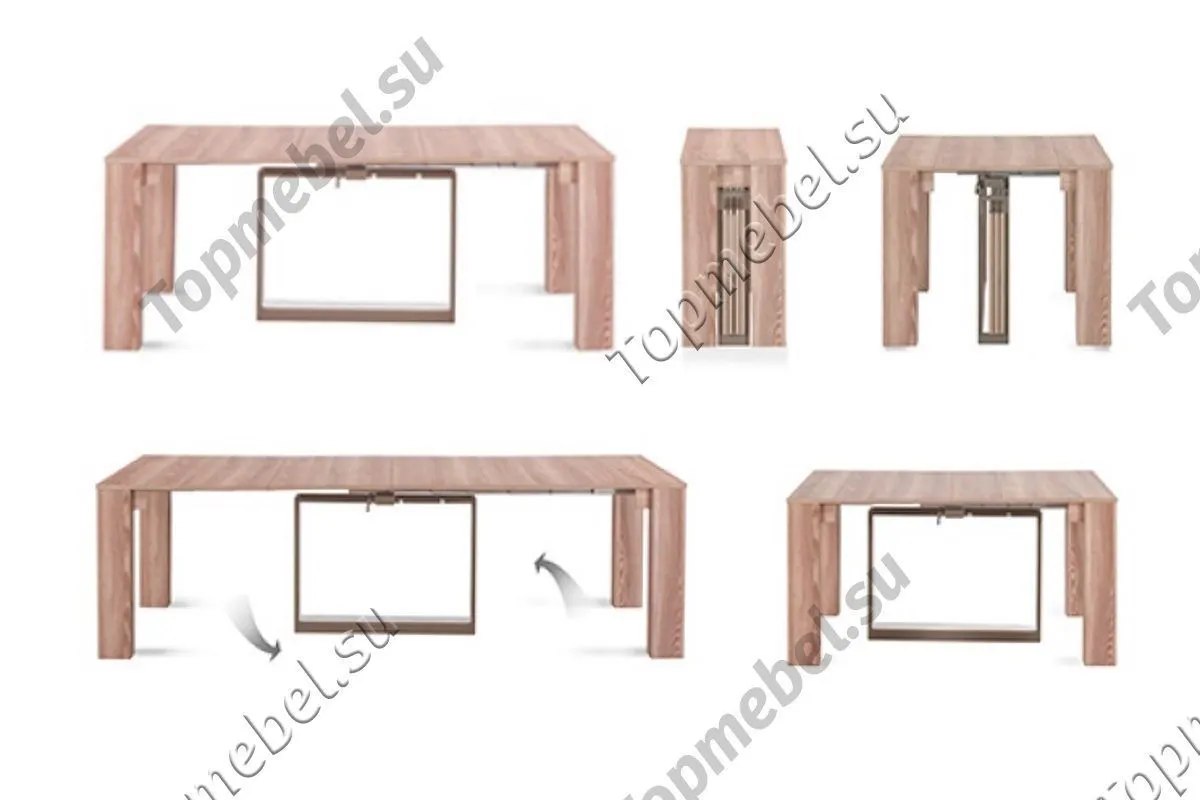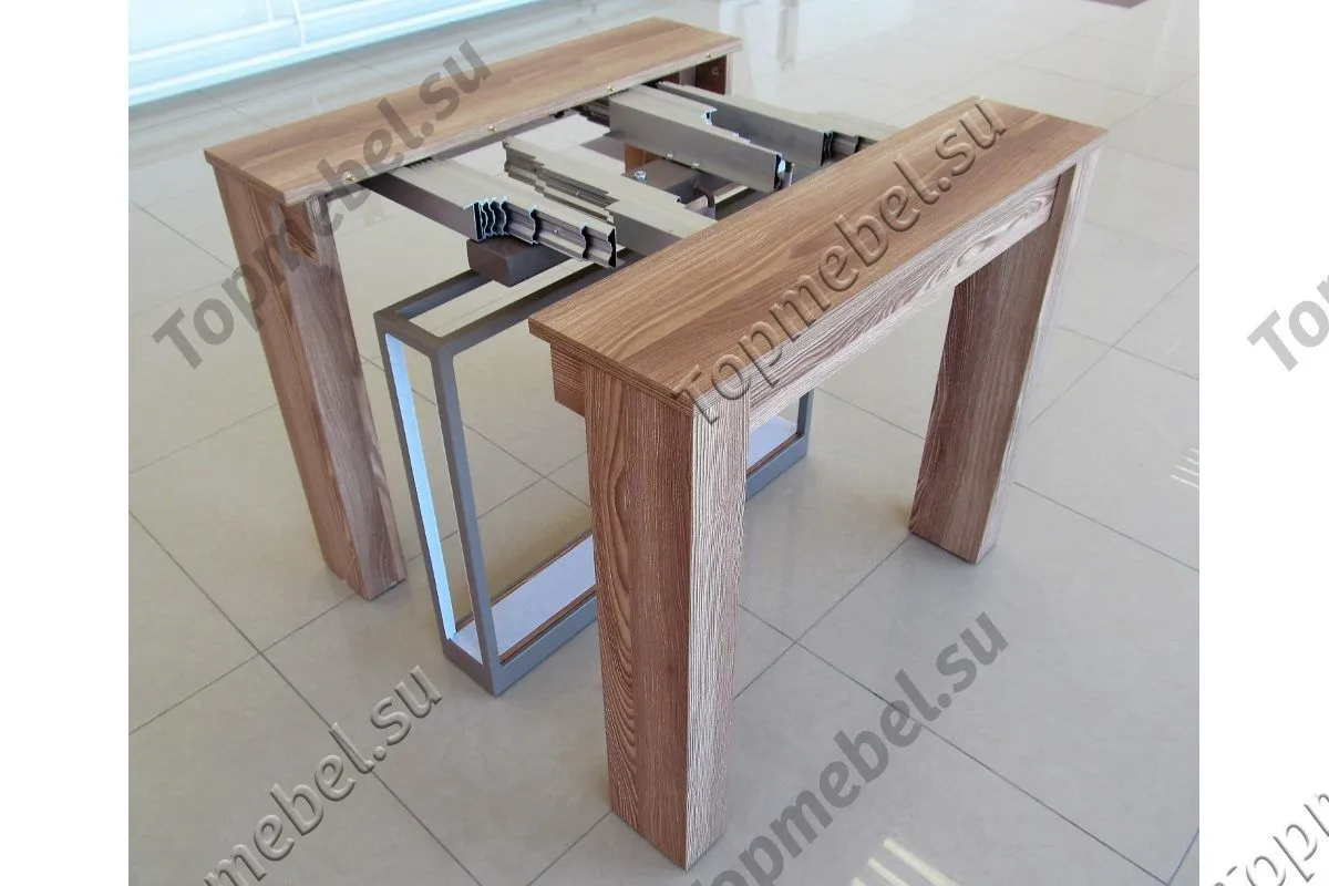 Из небольшого столика шириной 41 см легко раздвигается до длины 241 см, за счет 5 панелей-вставок шириной по 50 см каждая. При максимальной длине можно рассадить 14 человек. Стол выполнен из ламинированных панелей цвета "Орех", устойчивых к появлению царапин и отпечатков. Средние ножки — из стали, окрашены в общий цвет стола и в сложенном виде скрыты внутри больших боковых ножек. Преимуществом этом модели является возможность хранения панелей-вставок внутри стола на вращающейся металлической средней подставке. Их можно устанавливать в любом количестве, и стол может иметь любой из 5 размеров. Основные ноги имеют внизу пластиковые накладки, а средние ножки — ролики, что облегчает перемещение и раскладывание стола.
