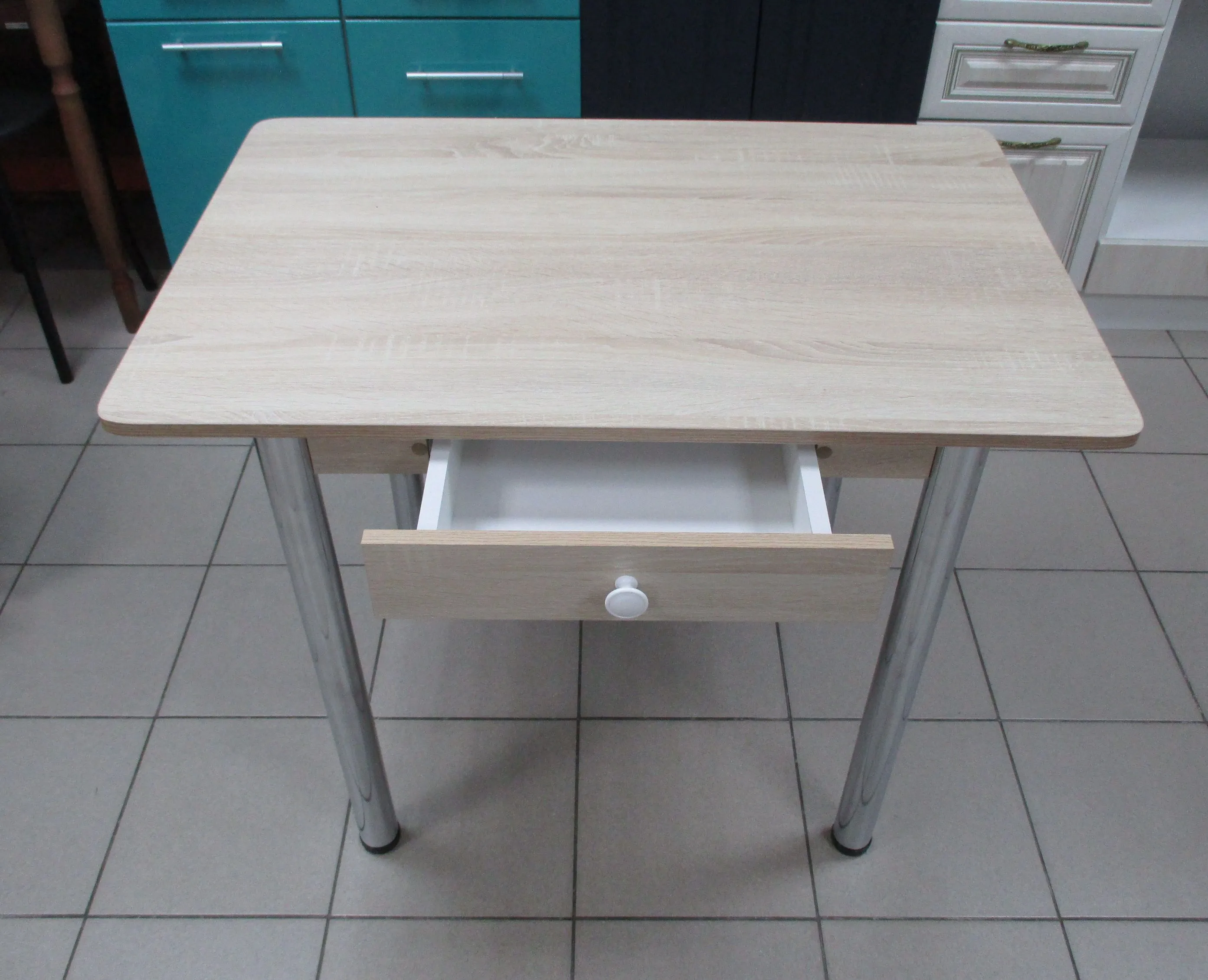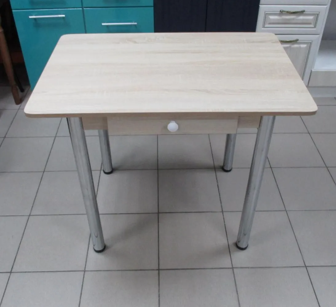 Небольшой удобный нераздвижной стол для кухни с вместительным ящиком и с хромированными прямыми ножками. Данная модель поставляется в разобранном виде
