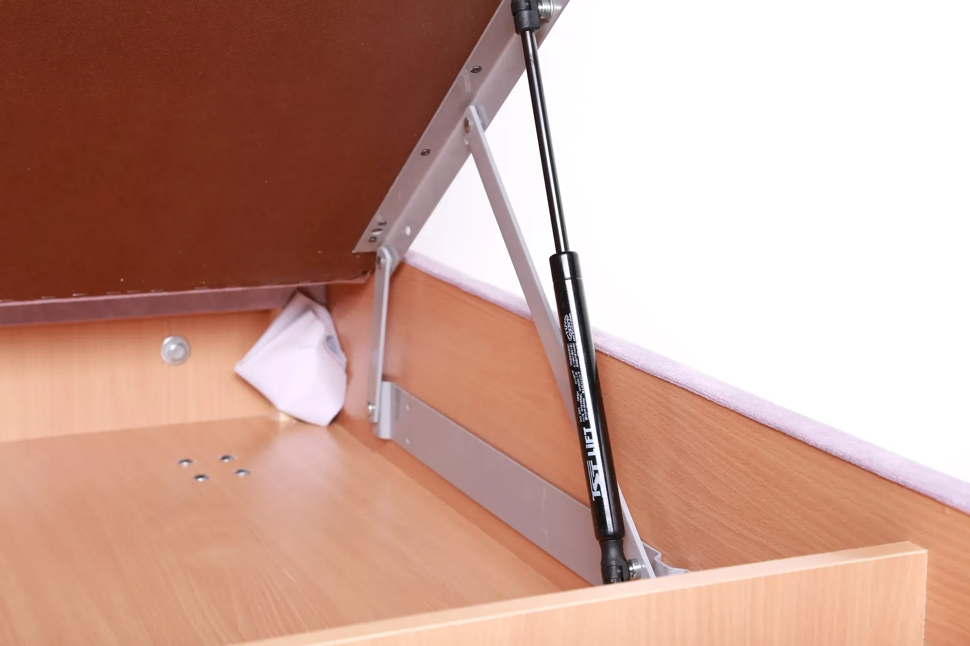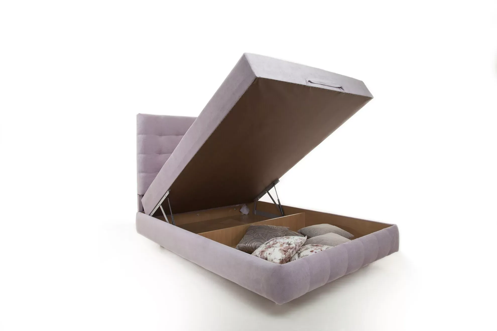 Тахта оснащена подъемным механизмом. Легкий доступ к ящику для принадлежностей обеспечивают установленные газлифты.