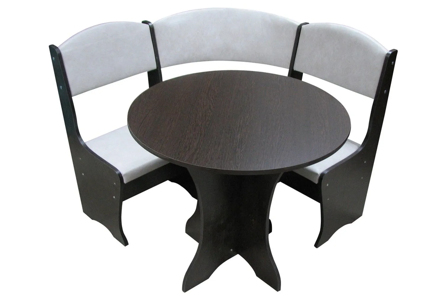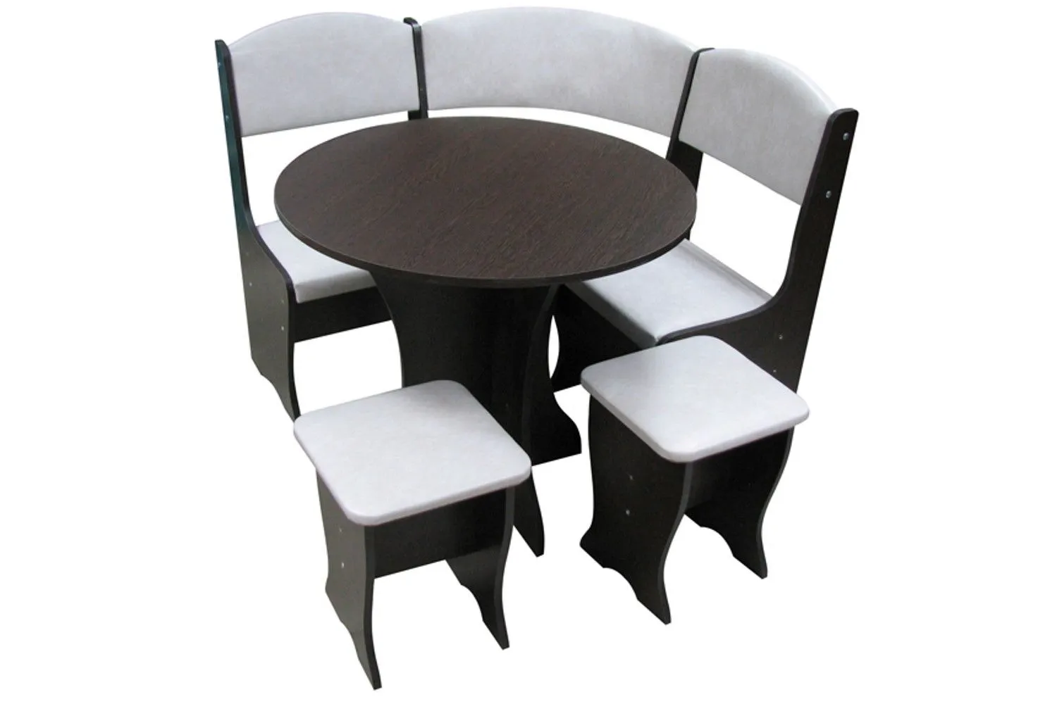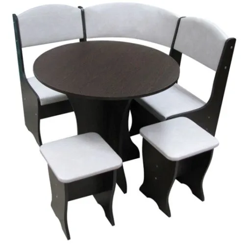 В набор кухонного уголка входит угловой диванчик, круглый стол и две табуретки.